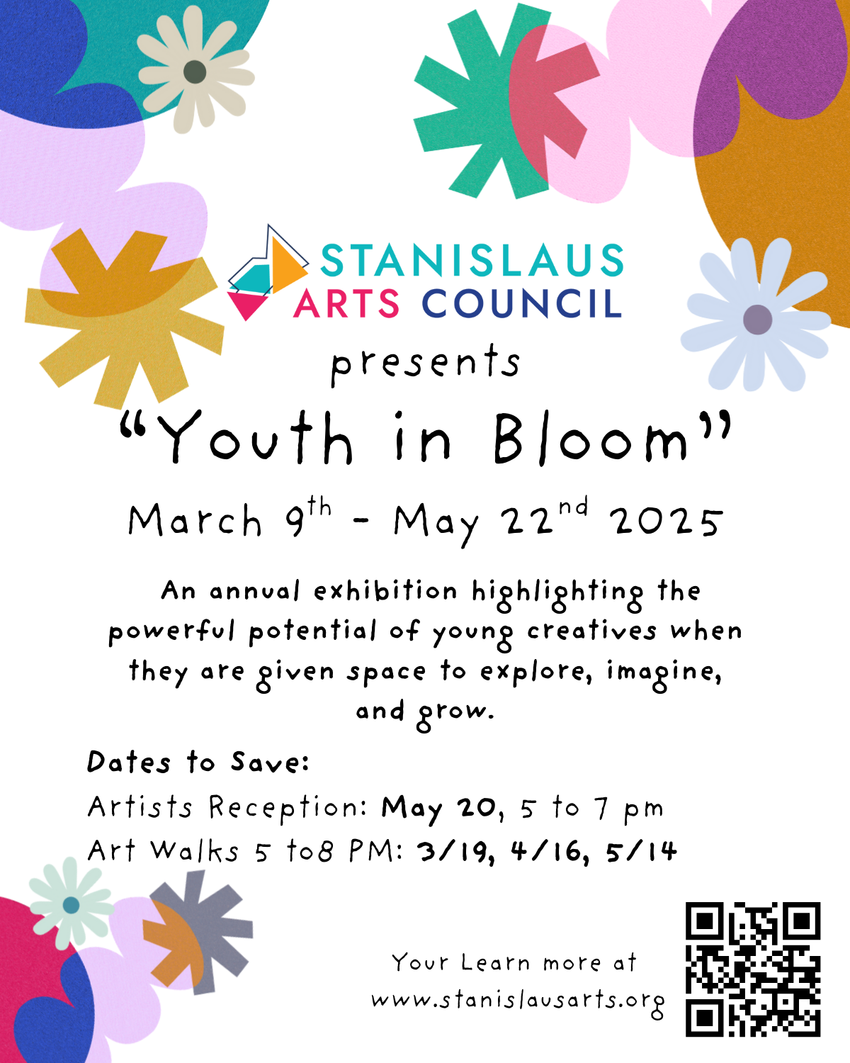 Celebrate the remarkable creativity of Stanislaus County’s young artists in our ongoing exhibition, Youth In Bloom, on display from March 9 through May 22. The exhibition showcases a vibrant array of works that reflect the talent, vision, and dedication of our local youth. Join us for the Reception on May 20 from 5:00 to 7:00 PM, with the Awards Ceremony beginning at 6:00 PM. We extend our heartfelt gratitude to the Elliot Community Celebration Fund for generously sponsoring this inspiring showcase of blooming talent.